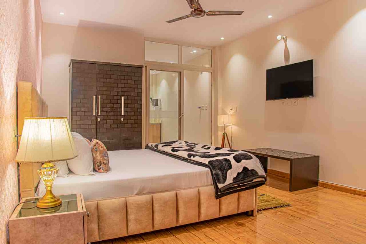 Un appartement moderne et luxueux au cœur du sud de Delhi avec une immense terrasse et une vue sur le parc, un bar en plein air et une pergola. La maison dispose de nombreuses commodités comme indiqué - Télévision 65 pouces avec tous les services de streaming ott. - Cuisine entièrement équipée avec OTG, lave-vaisselle, purificateur d'eau - Purificateur d'air. - Petit déjeuner sur demande - Repas cuisinés à la maison fournis pour des frais minimes. - Appartement bien éclairé, spacieux,entièrement climatisé. Expérimenté dans l'accueil de voyageurs de l'étranger. 2 chambres, peut accueillir 4 à 5 personnes.