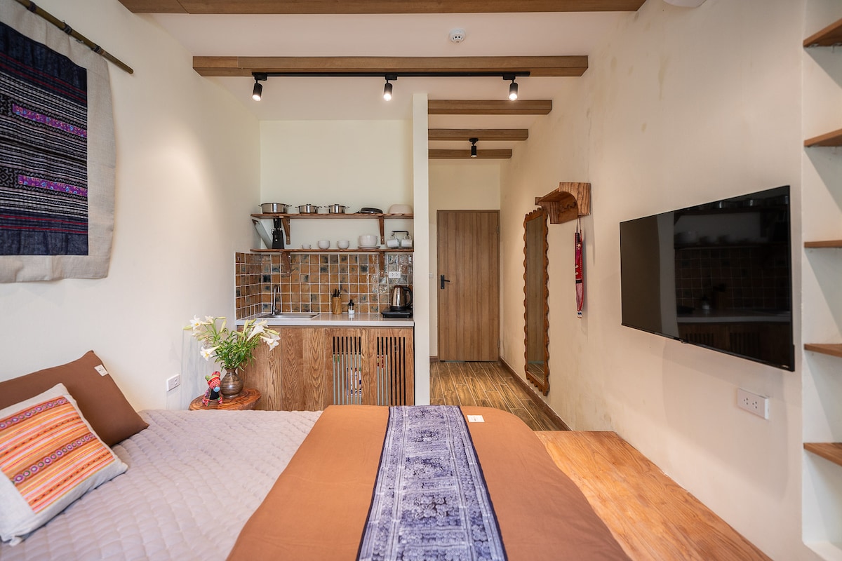 Palm House dispose de 5 chambres(1 chambre par étage). La chambre comprend 1 lit queen size, une table à manger, une table de travail/bureau, 1 coin cuisine (juste un ensemble vaisselle), une salle de bain privée, également une connexion wifi et une télévision connectée. Sur les 4,5,6 chambres, il y a une baignoire. ! ! ! Parce que les 2e et 3e étages sont bas, il est facile d'entendre le bruit de l'extérieur. Soyez flexible pour organiser une place de couchage raisonnable pour les membres de la famille.