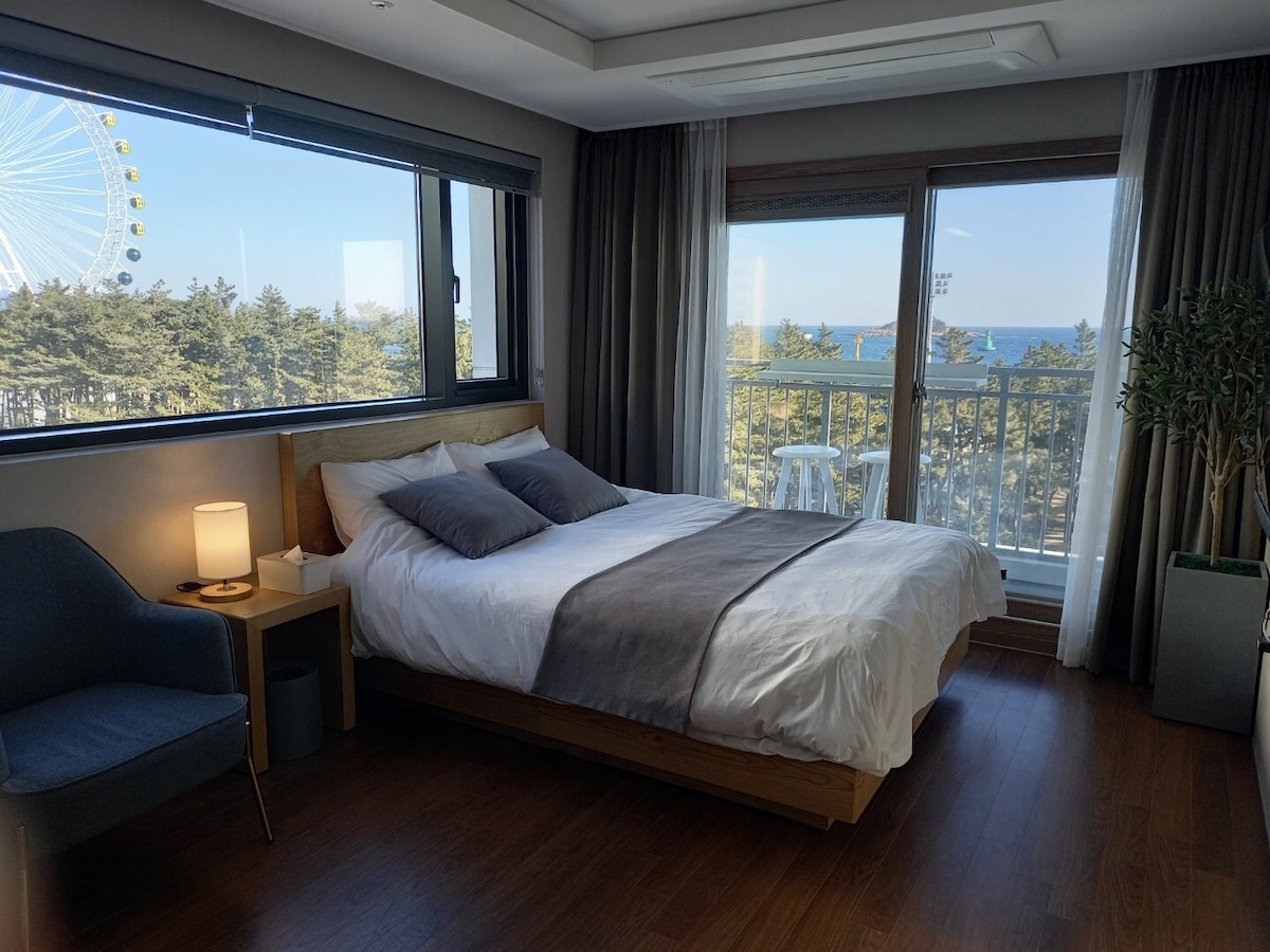 🥭C'est Mangone. La seule chambre pour 4 personnes Le bar-terrasse offrira aux clients la meilleure vue sur l'océan🏖️ et🧋 le lieu de dégustation de thé le plus délicieux. La plage est à 10 secondes du hall de l'immeuble,🏝️ et il y a des magasins de proximité à côté de l'immeuble. Il s'agit d'une chambre double avec un lit king size dans la première chambre et un lit queen size dans la deuxième chambre, ainsi qu'un grand lit premium🛏️ pour un sommeil confortable.💟 Dans le salon, il y a une table à manger🍽️ pour 4 personnes Thé et collations, vin, whisky, etc. Disponible (vin. whisky. verre de soju) est prêt. Les ustensiles de cuisine sont prêts. Les choses qui ne sont pas possibles Griller de la viande (viande crue) La viande grillée est possible. Poisson maeuntang, crabe, etc. L'odeur de poisson ne disparaît pas. Nous vous prions de bien vouloir comprendre que cela n'est pas possible pour les clients Toute la chambre a une vue sur l'océan et vous pouvez également profiter de la vue sur l'océan depuis la fenêtre du salon à la table🌊 à manger~ Le lever du soleil🌅 peut être apprécié depuis le salon de la première chambre sur la terrasse de la chambre. Alors je vous verrai bientôt🙏🏻