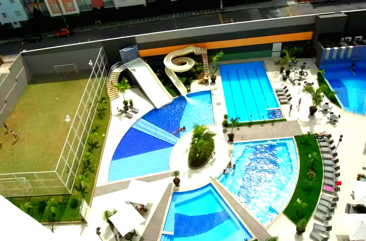 Appartement complet Lazer à 5 minutes de Hotpark ! L'espace comprend une suite avec un lit queen size, un séjour avec un canapé-lit et une salle de bains, une cuisine équipée (repas rapides), un balcon donnant sur la Serra de Caldas, la climatisation et une connexion Wi-Fi gratuite. LOISIRS 🏊♀️ EXCLUSIFS DE LA COPROPRIÉTÉ : ✅ 4 piscines incroyables (1 couvertes + 3 extérieures) ✅ Jacuzzi D'✅ un sauna ✅ Salle de sport ✅ Terrain de squash ✅ Sinuca ✅ Terrain de jeu pour enfants ✅ Restaurante ✅ Parking • En face de l'Esplanada feirinha