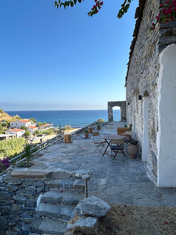 Das traditionelle Steinhaus grenzt an einer Seite an die natürliche Felswand. Das Bad ist ganz in den Fels hinein gebaut. Das ergibt ein ganz spektakuläres Wohngefühl und den Eindruck, mitten in der Natur zu sein. Die Terrasse hat eine wunderschöne Aussicht auf das Meer, den Strand von Fytema und die Berge von Messaria. Die Wohnung ist 2023 mit ökologischen Materialien im traditionellen Stil ausgebaut worden. Zum Strand sind es nur 200 m.