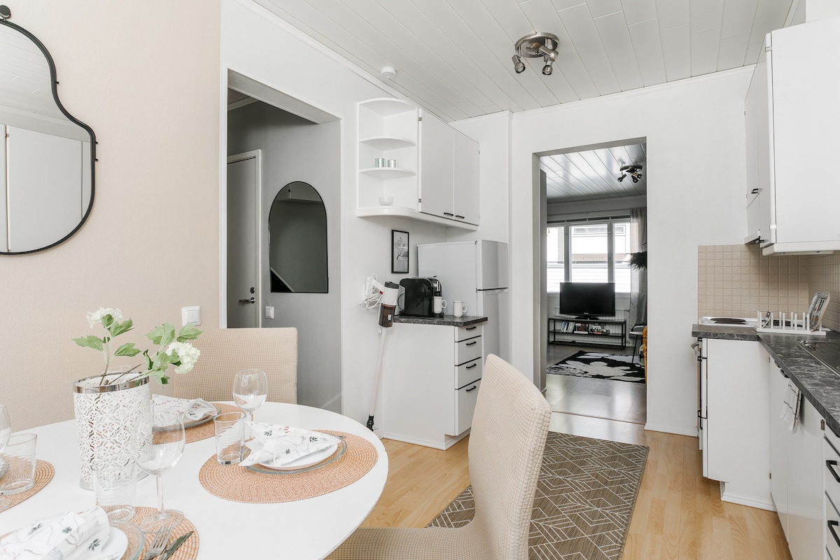 Appartement de 47m2. Au bord de la rue principale de la vieille ville idyllique ville de Naantali, au deuxième étage de la maison Luhtitalo. Emplacement calme. À distance de marche des services de la plage et du centre-ville. Place de parking gratuite dans la cour pour une voiture. L'appartement dispose d'un balcon et d'un sauna. Couchages pour quatre : Lit double de 140 cm de large dans la chambre. Dans le salon, un canapé-lit convertible en lit double (140 cm) ou deux lits séparés. Cuisine entièrement équipée. L'appartement dispose d'une connexion wifi rapide.