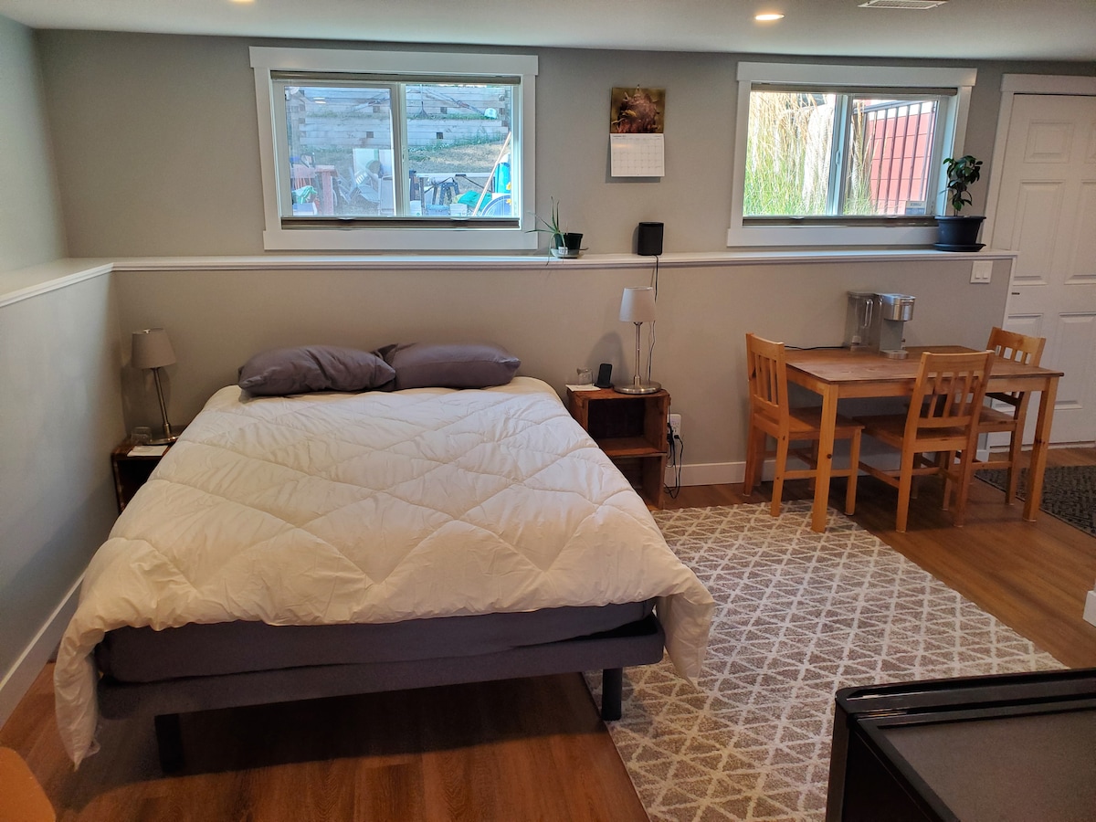 Bienvenue à Kamloops ! Cette suite studio est décorée de manière moderne et est proche des transports en commun, des restaurants, ainsi qu'à quelques minutes en voiture de la route transcanadienne. Comprend une buanderie, une connexion Internet haut débit, une cuisine, un lit queen size, une télévision connectée avec Netflix et une entrée privée. Vous pouvez utiliser la terrasse, mais il s'agit d'un espace commun et elle ne fait techniquement pas partie de la location. Il y a beaucoup de randonnée pédestre, de VTT et de ski (à 45 minutes de Sun Peaks Resort), alors venez explorer ! Le logement n'est pas adapté aux bébés et aux jeunes enfants.