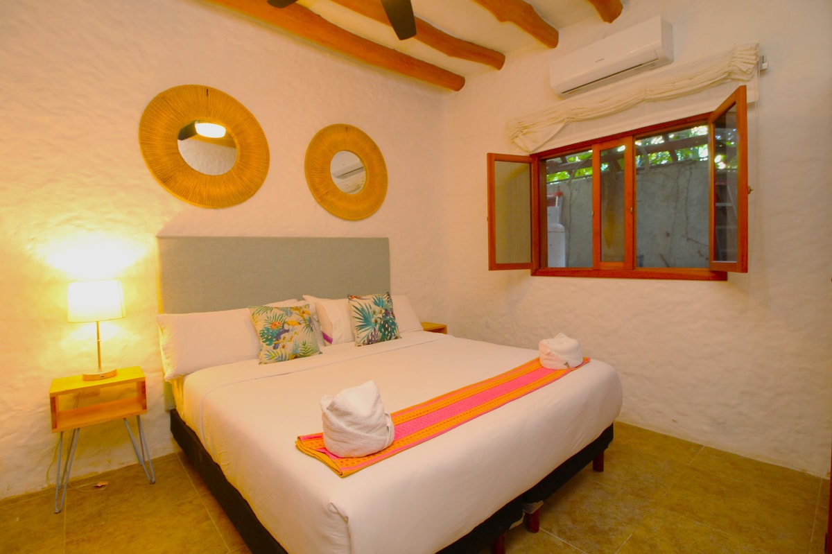 Suite Caracol : belle et élégante, située au rez-de-chaussée, elle dispose d'un lit king size. Avec vue et accès au jardin, derrière le bâtiment principal. Ce bel espace confortable est un mélange parfait de design avant-gardiste avec les matériaux les plus basiques de la région. La salle de bain entièrement équipée comprend une douche à effet pluie, ce qui rend votre expérience de toilette délicieuse.