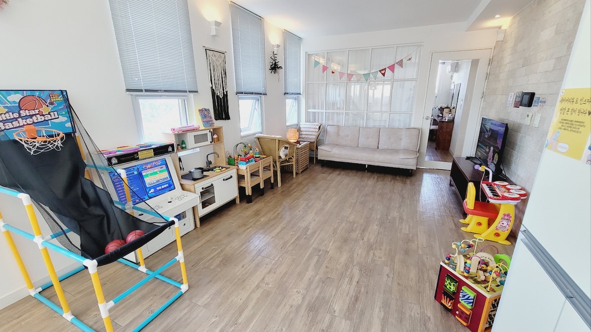 단독으로 사용하는 프라이빗한 공간입니다. 힐링여행 또는 연인에게 감동을 주고싶은 분들께 ~ 객실 - 더블침대 1개 넷플릭스 시청이 가능한 TV (이곳은 2인 전용 특가입니다.) 3인 이상시 별도문의해주세요.~ 지하 - 게임시설 (넷플릭스시청,닌텐도위,노래방기계) 각종게임도구들, 컴퓨터, 레트로게임) 1층 - 주방 시설 과 식사테이블 1.5층 - 거실 과 테라스 마당 - 테이블 과 의자(흡연공간 별도) 주방 - 식사테이블 객실내 에는 침대1800사이즈, 의자2개, 벽걸이에어컨, TV(넷플릭스, 케이블TV등), 스팀다리미, 화장대, 업무용책상, 사무용품, 5G인터넷 등이 준비되어 있습니다. 어메니티 칫솔,치약,면도기,샴푸,린스,비누,기초화장품,드라이기,헤어밴드,면봉,클렌징,빗,타올 무료주차(1대), 물, 얼음, 차 등 무료제공