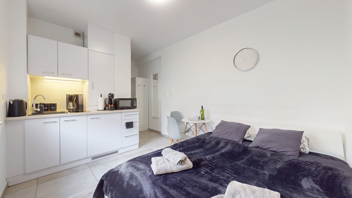 Les voyageurs du petit studio d'une superficie de 20 m2 disposent d'une chambre avec une kitchenette et d'une salle de bain avec douche. Le studio dispose d'une télévision, d'un grand lit double de 160x200cm, d'une table, de 2 chaises, d'une armoire et d'une cuisine entièrement équipée avec un réfrigérateur, une plaque de cuisson à induction, un micro-ondes, une bouilloire, un grille-pain, une machine à café à débordement et un Dolce Gusto. Cela comprend des draps, des serviettes, un fer à repasser, un sèche-cheveux, un plateau/bouilloire, de l'eau et une bouteille de vin de bienvenue. Prix par nuit pour 1 personne - 159 $ , pour 2 personnes - 179 $