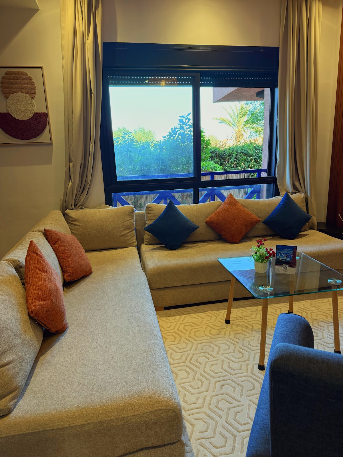 Our apartment is conveniently located in the heart of Marrakech. The train station, numerous cafes, restaurants, grocery stores, and supermarkets are all within walking distance. The airport is just a 12-minute drive away, making it ideal for travelers. • The property offers High-speed Wi-Fi, Netflix & IPTV, air conditioning, an indoor pool, a fitness center, private, covered parking, and 24/7 security & surveillance.