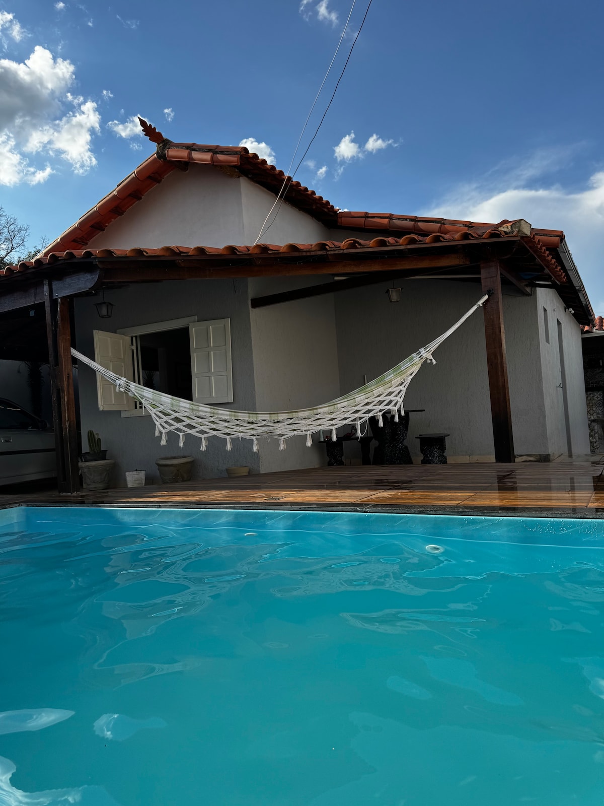 Aqui temos uma bela piscina , garagem até três carros , dois quartos , 3 banheiros , Sala espaçosa , cozinha , área de churrasqueira , fogão a lenha , Bilhar ( Sinuca), varanda com vista pra piscina e mesa de varanda e jardim , nossa acomodação contém 5 camas , duas de casal , uma beliche e uma de solteiro , um sofá central , uma poltrona , duas TV acesso a Netflix , Wi-Fi , duas cadeiras de balanço , área de lazer que é ótima para jogos e resenhas familiares . Pertinho da Serra do cipó