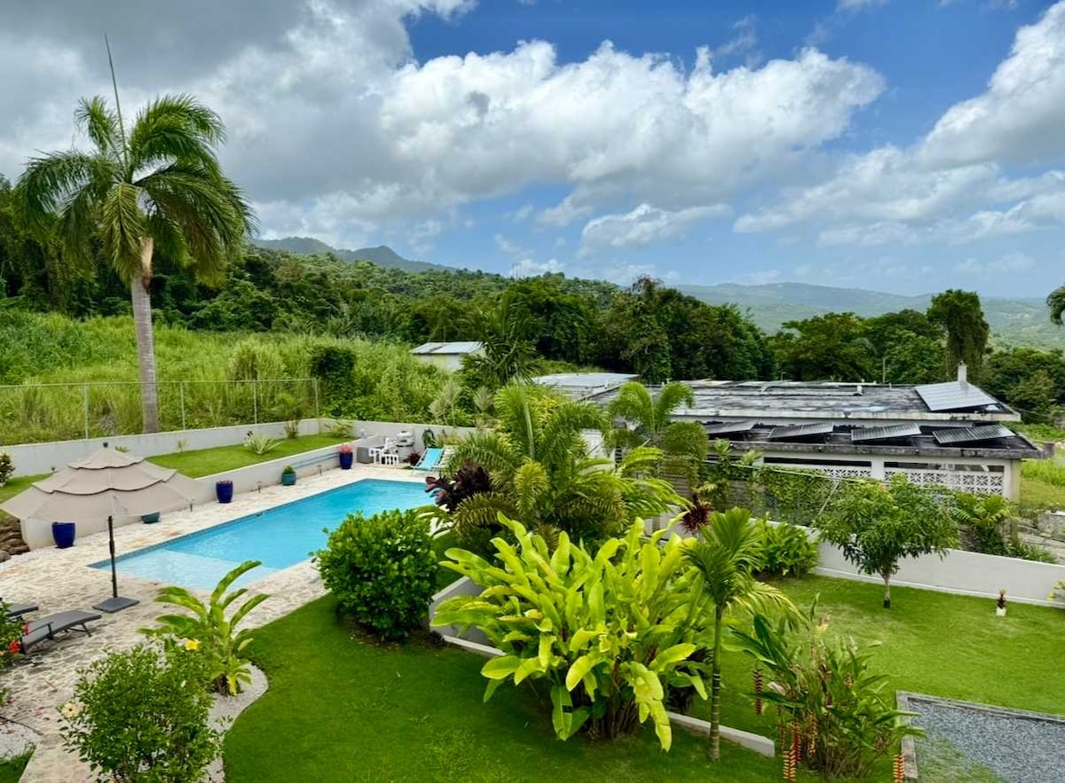 House is surrounded by acres of tropical rainforest, yet only 1 mile from PR3. Ocean & Mountain Views. 10'x20' salt water pool just steps from your front door. Pool is not shared with anyone else. King Master Bedroom Suite Gated property, gated pool. Large patio with grill and plenty of seatjng. Concrete house: safe, secure, sound proof. Full solar/no blackouts! Families & Kids Welcome! Luquillo Beach, El Yunque, Carabali Park within 5 miles!! 20 miles from SJU. 2nd Floor occupied by Host
