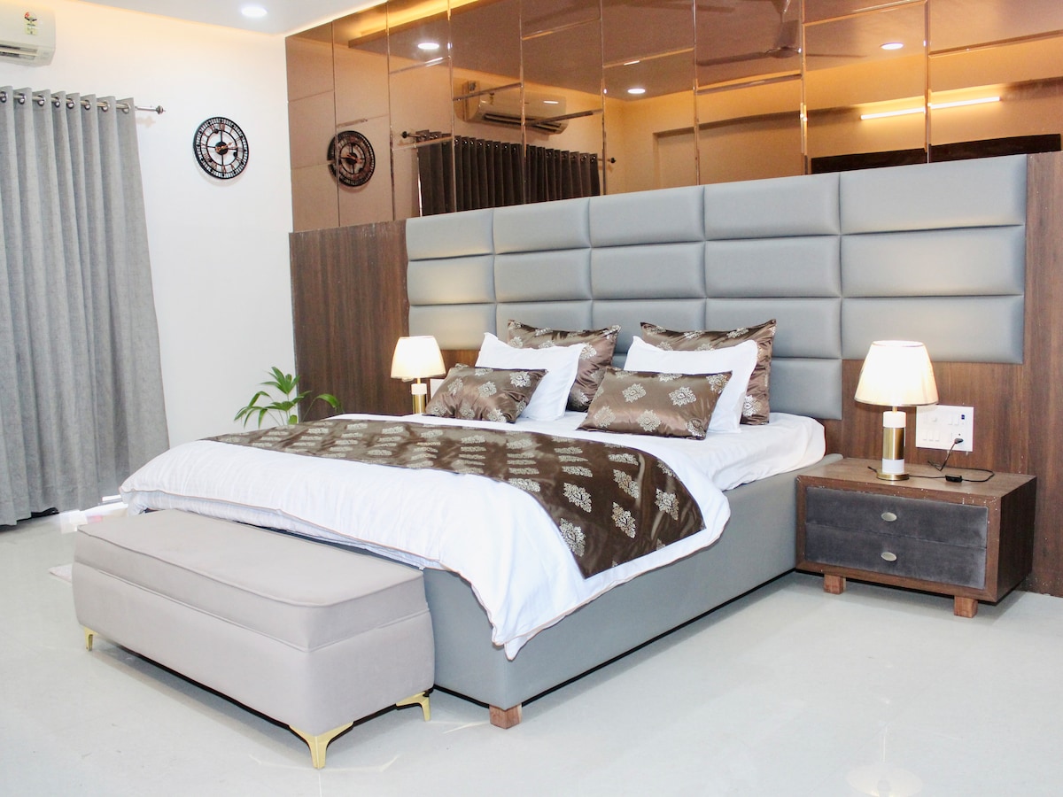 Un confortable appartement 2BHK situé au premier étage, idéal pour les familles et les voyageurs. Comprend 2 chambres climatisées avec salles de bains attenantes, télévisions intelligentes, une cuisine bien équipée, un salon non climatisé et un balcon privé. Les voyageurs ont également accès à une terrasse commune avec des sièges haut de gamme. Situé dans un quartier résidentiel calme à proximité des points forts de la ville. Pas d'ascenseur disponible. Wi-Fi inclus.