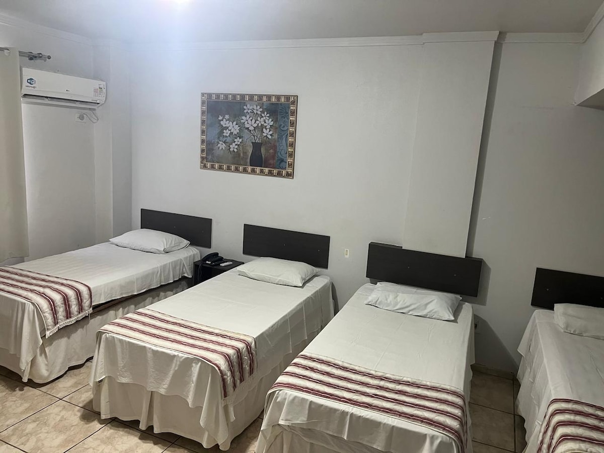 Quarto com 4 camas de solteiro , frigobar, micro-ondas e ar condicionado na região central de Joinville.