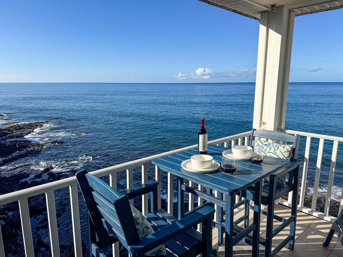 Right-on-the-ocean, newly renovated, upscale and spacious condo in a gated boutique complex. Unbelievable views from the lanai and living room. Top floor corner unit with windows everywhere so you feel like you are living outside. King bed and queen sleeper sofa with memory foam mattress for up to 4 guests. Ocean-front pool with community BBQ. Quiet; set back from Ali'i Drive. Close to everything--just one mile from downtown Kona. Reserved parking spot. AC.