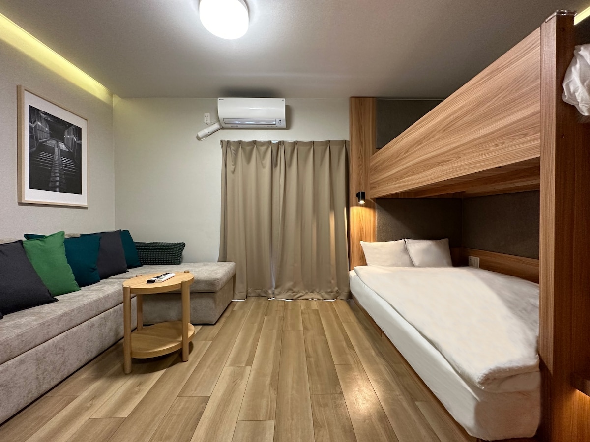 Zone ◆populaire, à la mode, calme et sûre ! Chambre spacieuse, propre et confortable avec 2 lits doubles, 1 lit simple et 1 canapé-lit. Profitez d'une promenade relaxante dans le quartier avec de nombreux cafés élégants et boutiques spécialisées. À seulement 7 minutes à pied de Shinsaibashi et à 3 minutes à pied du supermarché/pharmacies/dépanneur ouvert 24h/24. Accès facile avec 5 minutes à pied de la rue Sakaisuji Honmachi et 6 minutes à pied de la rue Nagahoribashi, qui dispose d'escaliers mécaniques pour un transport pratique même avec des bagages lourds.