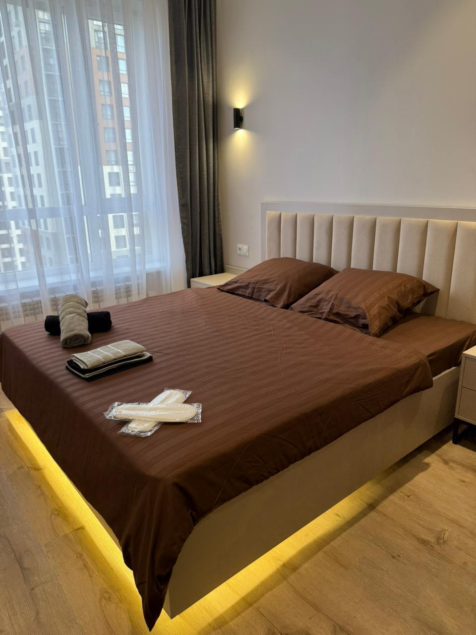 Очень хороший красивый новый современный дом со всеми удобствами, шикарный подъезд, двор огорожен, внутри бесплатная парковка. Видеонаблюдение круглосуточное. Быстрый Wi-Fi. очень теплая, чистая, уютная квартира. В квартире есть все необходимое для проживания вдали от дома. Кровать и диван (раздвигается). Посуда для приготовления и приема пищи, постельное белье и полотенца. Стиральная машина, сушилка, утюг, гладильная доска. Остановка прям возле дома.