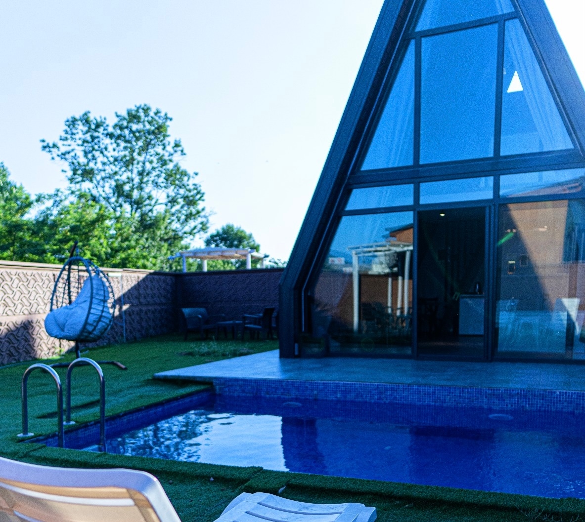 Détendez-vous dans cet espace calme et élégant. Elle dispose d'une grande zone d'utilisation très différente des maisons dôme standard, d'une piscine, isolée, climatisée, d'une cuisinière, d'une cheminée, d'un purificateur d'air, d'un jacuzzi, d'un jardin indépendant 100 % abrité, d'un barbecue et d'une projection. Dans notre maison, qui est en contact avec la nature, vous pouvez allumer votre cheminée et profiter de la projection depuis l'écran devant vous pendant que vous êtes dans votre jacuzzi. Agu Nature pour des vacances d'hiver agréables, confortables et confortables