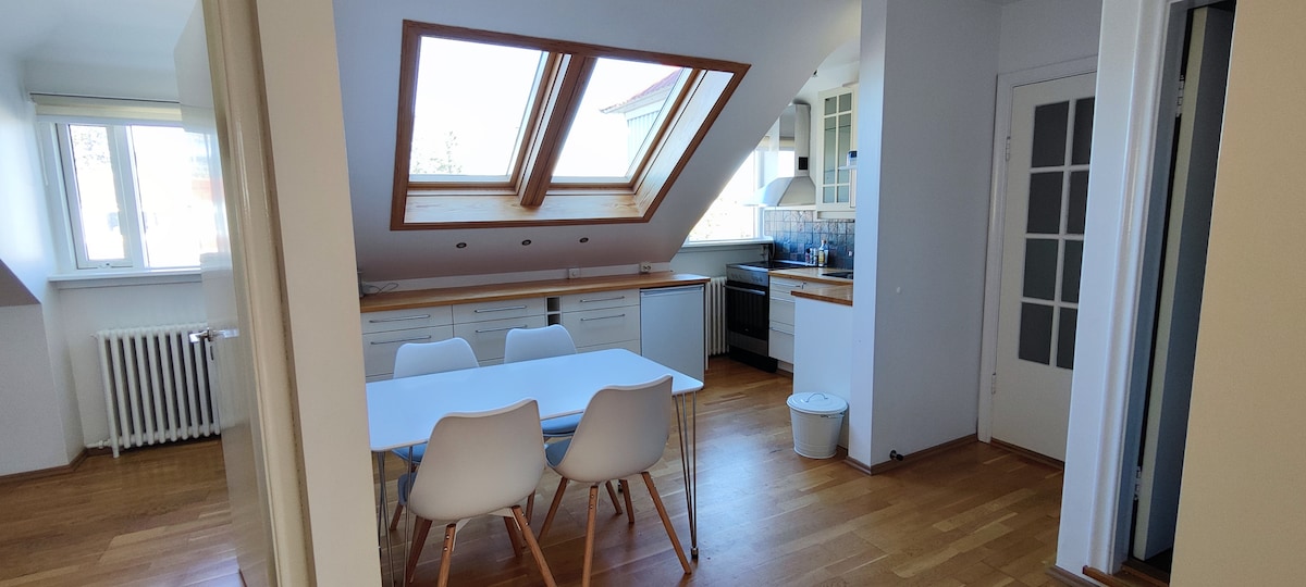 Appartement penthouse élégant et confortable en plein centre de Reykjavik. À seulement 2 pâtés de maisons de la rue principale dans un quartier très calme. Les principales rues commerçantes, restaurants, bars et musées sont tous à moins de 5-10 minutes à pied. Équipé de tout ce dont vous avez besoin pour un séjour de courte ou moyenne durée. Très proche des arrêts de bus touristiques n° 6 et n° 14 (voir busstop dot is).