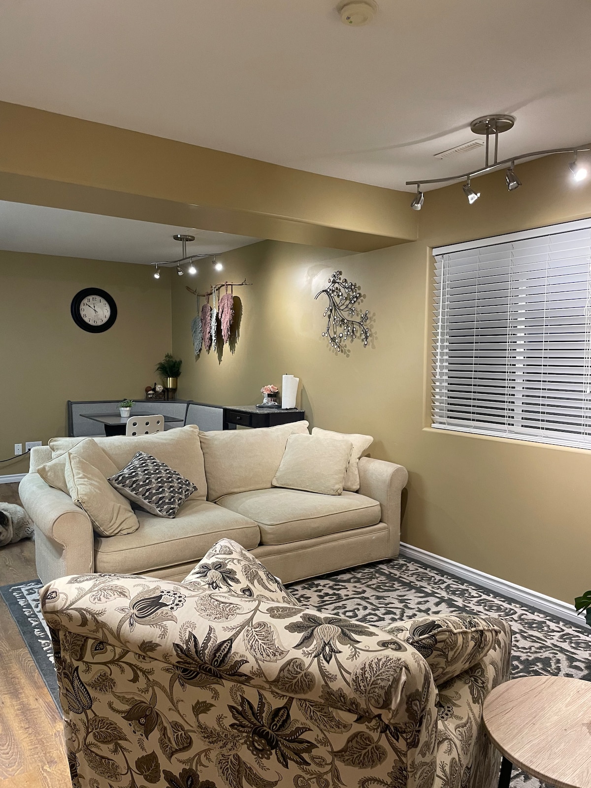 Spacieux : peut accueillir confortablement 8 personnes (4×2). Propre, lumineux, PAS d'escaliers. 2 chambres + matelas pliant queen size + lit escamotable queen size, salle de bain 4 pièces, buanderie, cuisine/salle à manger complète - équipements de cuisine mais PAS de cuisinière. Téléviseur 55" - Netflix, Prime, Roku, Tubi, You Tube etc. 1000 pieds carrés de propreté, de calme et de confort ! Cuisine entièrement équipée avec divers : condiments/assaisonnements/épices. Nous offrons gratuitement du café frais moulu, des crèmes aromatisées, du thé, du jus de fruits, des barres de céréales et des collations aux fruits pour vos petits matins ☺️