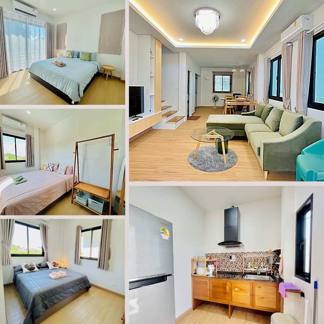 Baan Safe Zone, l'escapade parfaite. La fonction de la maison sur une superficie de 78 m ². La surface habitable est de 103 m ². Elle comprend : • 3 chambres, 2 salles de bain - Il s'agit d'une chambre de 6 pieds et d'un lit double de 5 pieds et d'un lit double de 3 pieds. • Les chambres sont entièrement climatisées dans toutes les chambres et la climatisation dans le séjour. • Les salles de bain disposent d'un chauffe-eau. • Salon, TV 42 pouces, TV gratuite, Wifi gratuit, Netfix • Café salle à manger avec chaise 8 places • La cuisine était bien approvisionnée en fournitures • Coins récréatifs et tapis de course électriques • Pelouse large, parking aisé