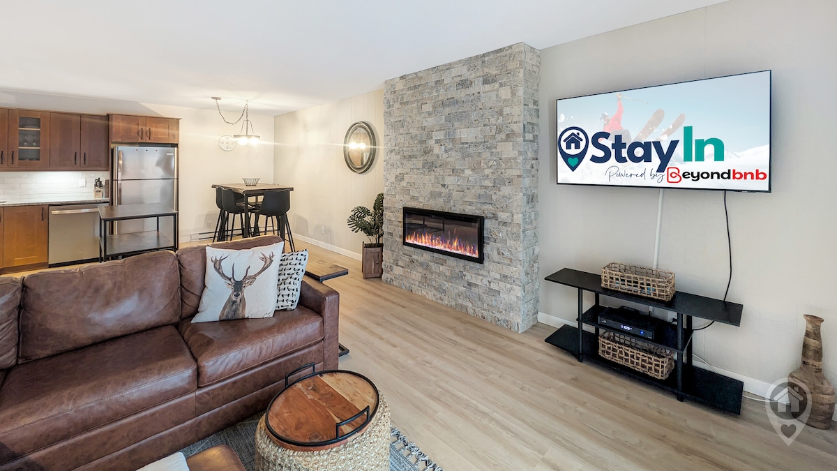 Appartement confortable d'une chambre InnWest à quelques pas de la station alpine de Kimberley. Emplacement idéal à côté des pistes de ski de fond, parfait pour la marche et le vélo en été. Profitez d'une chambre queen avec linge de lit de qualité hôtelière, d'une salle de bain complète avec serviettes moelleuses, d'une cuisine entièrement équipée avec café, d'un salon confortable avec cheminée à gaz et d'un patio avec vue sur la montagne. Accès au jacuzzi, à la piscine saisonnière, au sauna et à la buanderie commune. Parfait pour une escapade relaxante en montagne.