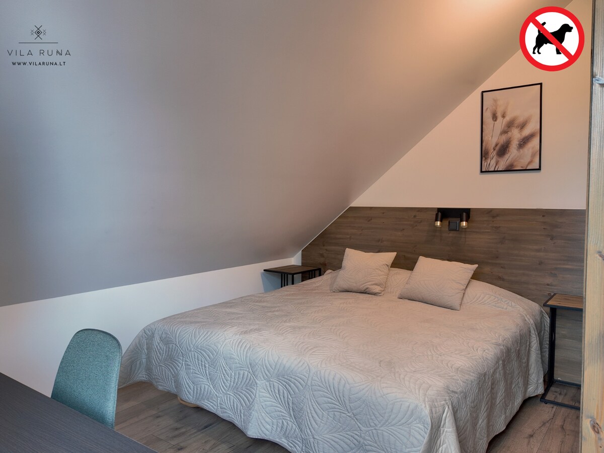 Chambre double avec salle de bain privée. Profitez d'équipements modernes et d'une lumière naturelle abondante, créant une atmosphère tranquille et accueillante pour un séjour paisible. Capacité : 2 personnes Petit déjeuner : disponible pour 7,50 € Animaux non acceptés Les enfants de moins de 2 ans séjournent gratuitement lorsqu'ils partagent la literie existante avec les parents.