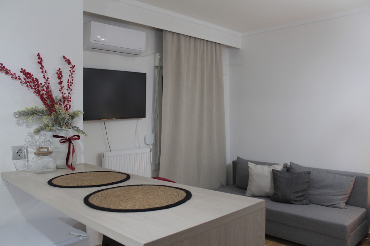 Chers amis, je vous souhaite la bienvenue dans le tout nouveau studio que j'ai créé il y a quelques jours et j'espère que mon logement répondra à vos besoins. Un beau studio chaleureux et entièrement équipé est prêt pour vous. Dans un quartier calme, dans le quartier d'Épire, à 5 min à pied du centre ville. À 100 mètres, vous trouverez la célèbre boulangerie « Sideris » ainsi qu'un supermarché. L'arrêt d'autobus se trouve à seulement 200 mètres. Il y a beaucoup de places de parking dans le quartier.