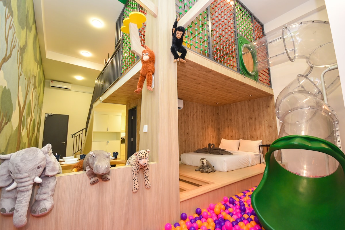 Bienvenue dans notre Jungle Treehousesuite à Sunway Grid ! Notre maison adaptée aux enfants offre un toboggan en spirale amusant avec une piscine paradisiaque en contrebas ! Vos enfants vont adorer ! Nous avons également une console de jeux d'arcade pour que les enfants puissent profiter des jeux rétro ! Profitez d'un accès à la piscine olympique et aux attractions à proximité comme Sunway BigBox Mall, Legoland, et plus encore. Accès à➤ pied à Sunway BigBox, Starbucks et X-Park À ➤ 8 minutes en voiture de LEGOLAND À ➤ 8 min en voiture de Puteri Harbour(Hard Rock Cafe)