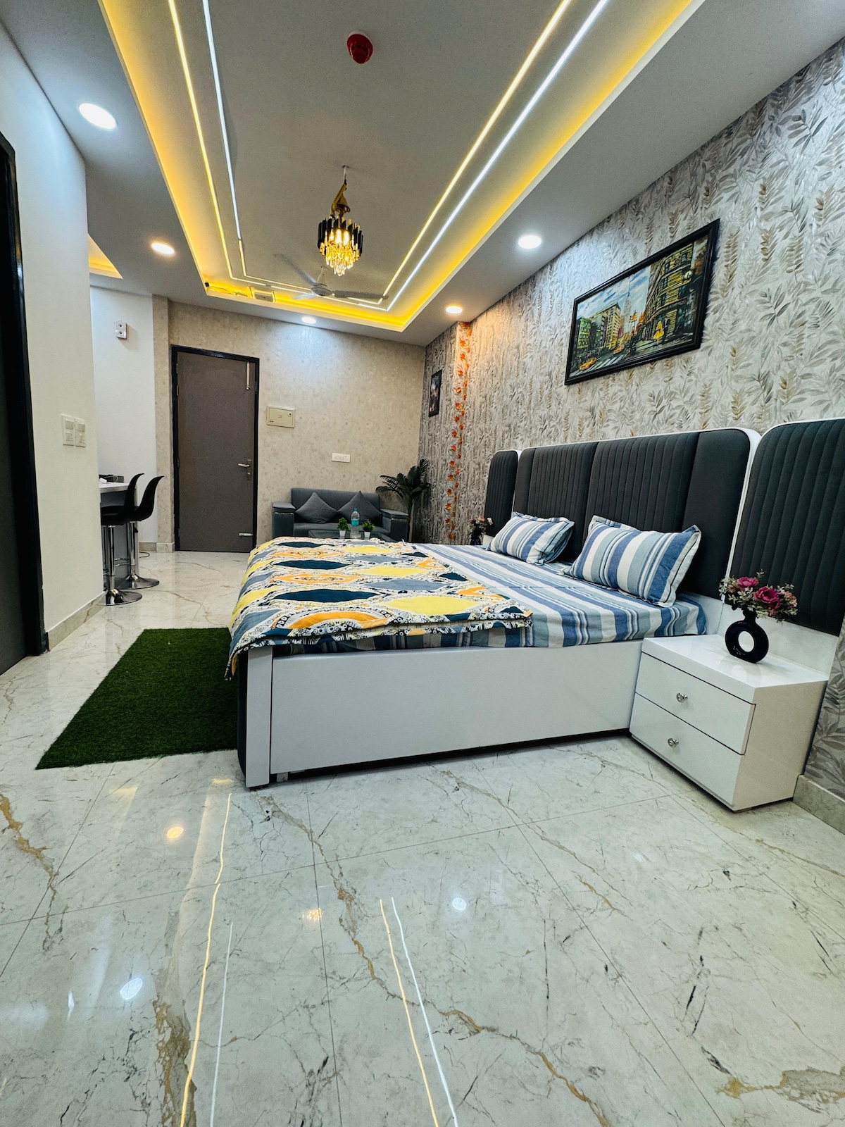 C'est un appartement studio d'une chambre * entièrement meublé * Propreté et propre * Entièrement climatisé * Wi-Fi rapide * Télévision connectée Android QLed 4k 43 pouces * Système de home cinéma JBL * Purificateur d'eau RO * Micro-ondes * Cuisinière à gaz pour cuisiner * ustensiles de cuisine * Réfrigérateur * geyser dans la salle de bain * bétail électrique * Fer à repasser * Sèche-cheveux * matelas supplémentaire (frais supplémentaires)