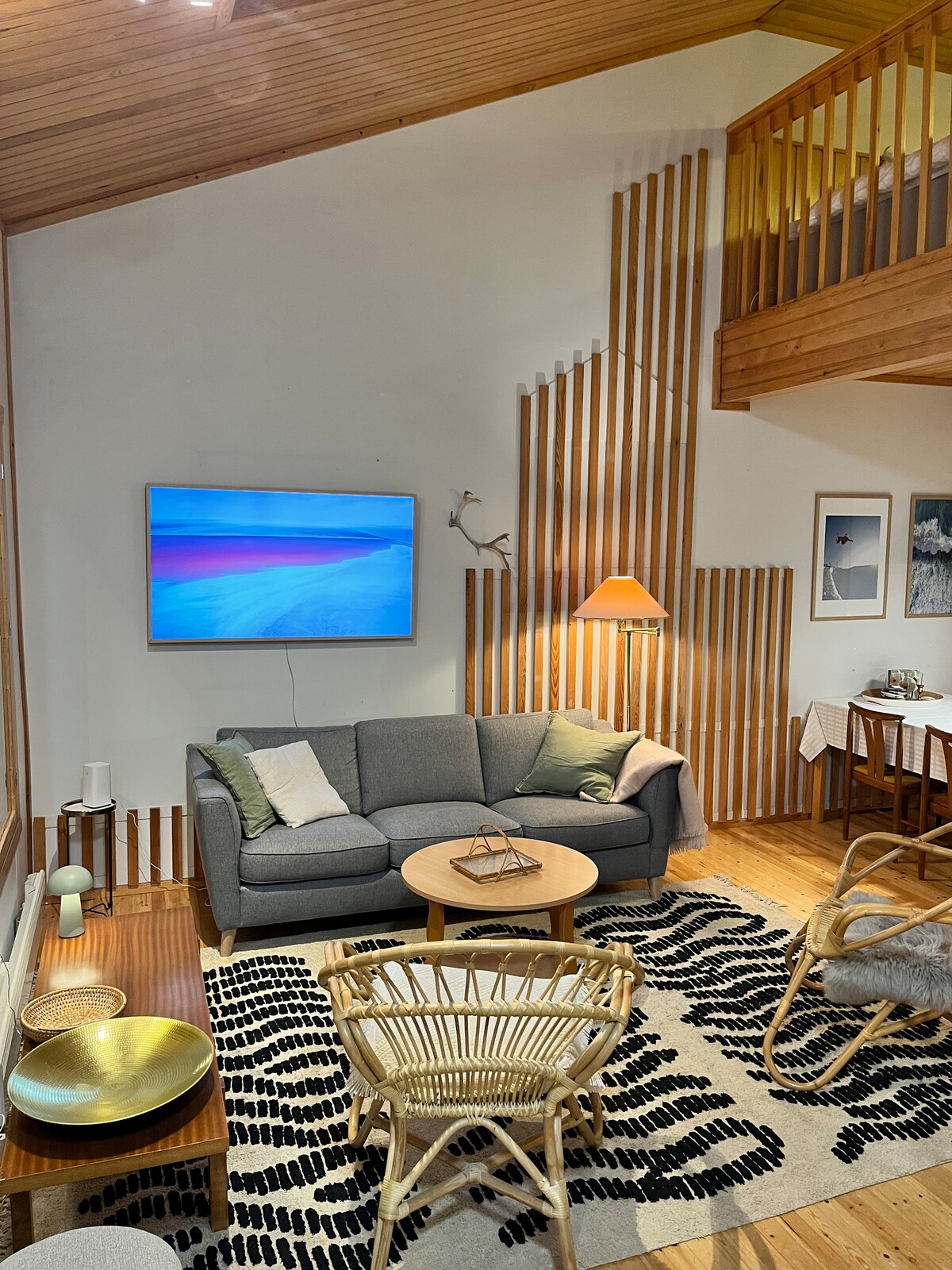 La Villa Kalliorintene se trouve à seulement 10 km de Ruka. Rénovée en 2019, la villa est située sur la rive du lac Kitkajärvi avec une superbe promenade au sommet d'une falaise. Le voisin le plus proche est bien situé, votre intimité garantie. Vous aurez accès à des salles de bain modernes, une cuisine ouverte, une télévision à écran plat 55pouces et une connexion wifi gratuite. Il y a des couchages pour 6 personnes. Une chambre avec un lit double et un loft comprenant un lit double ainsi qu'un canapé-lit.