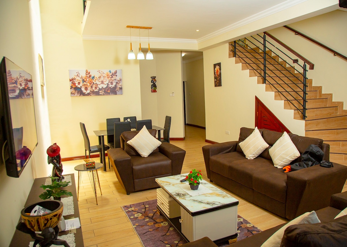 Bienvenue dans notre maison de ville confortable de 7 voyageurs ! Profitez d'une charmante retraite d'un étage avec des équipements modernes. Détendez-vous dans le salon ouvert, cuisinez dans la cuisine entièrement équipée et dînez ensemble. 4 chambres avec salle de bain attenante pour assurer un séjour reposant. Profitez de spectacles sur la télévision à écran plat ou de soirées jeux amusantes. Restez connecté avec le wifi et profitez du linge de maison frais et des articles de toilette. Situé près des attractions autour d'Aburi, à 25-30 minutes de l'aéroport, c'est votre escapade de vacances idéale. Réservez maintenant et créez des souvenirs inoubliables !