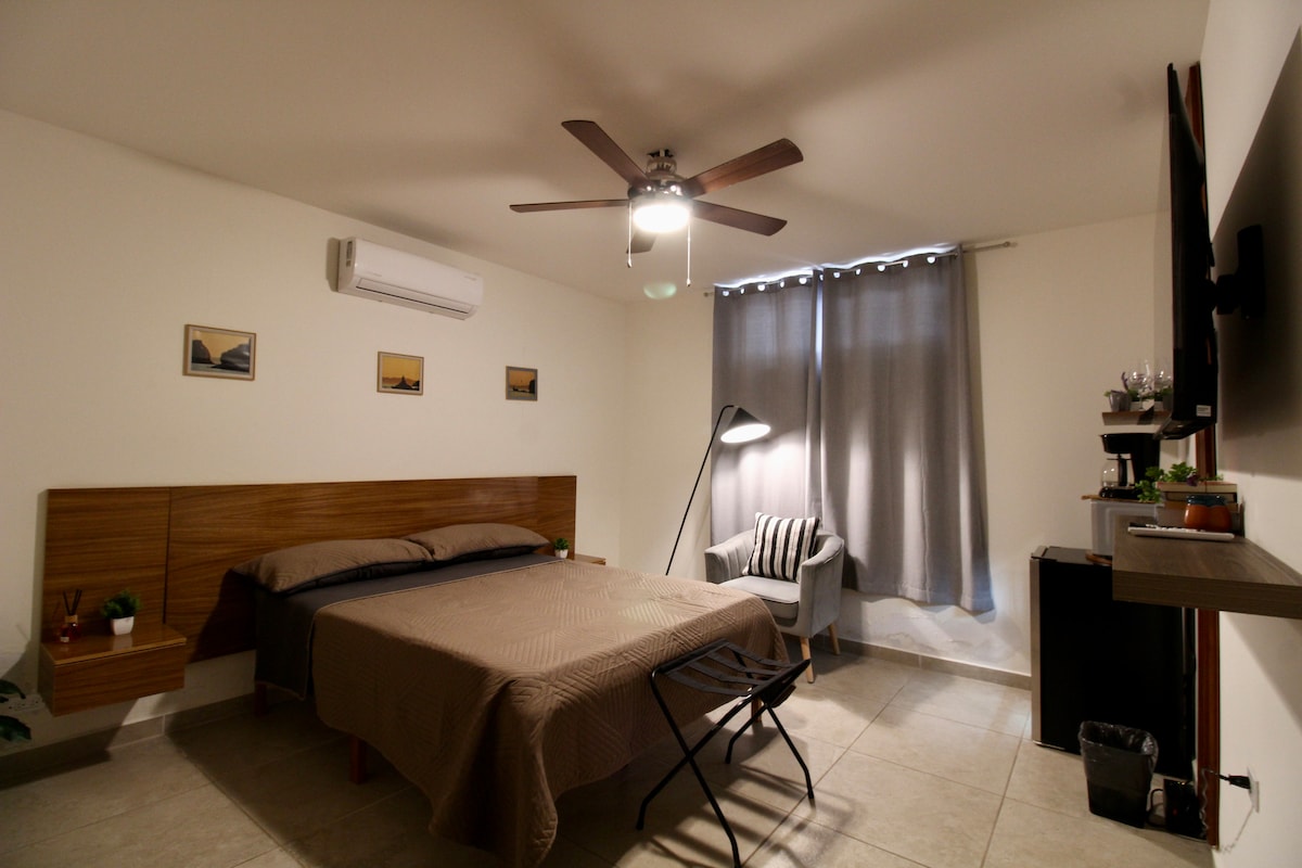 Profite de la simplicité de cet hébergement calme et central. À quelques pâtés de maisons du front de mer pour des promenades tranquilles où il y a des cafés, des bars dans une ambiance familiale. L'espace est pour un couple, il dispose d'un canapé-lit supplémentaire pour une personne supplémentaire, il dispose de sa kitchenette équipée, d'un espace de travail, d'un lit double et d'une salle de bain spacieuse avec des détails modernes, idéale pour passer quelques jours, il n'a pas son propre parking, il est en ligne de rue. L'espace est NON FUMEUR