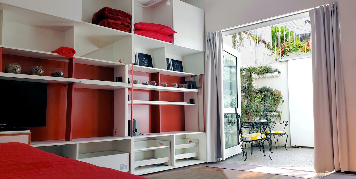 PH une chambre avec lit double et patio/jardin avec plantes. Idéalement situé mais paisible. Salle de bain complète et cuisine avec ustensiles et linge inclus. Accès indépendant par une cour lumineuse pleine de végétation. Serrures avec serrures sur toutes les portes. Grand rangement. Télévision par câble, WIFI, coffre-fort, équipement de musique Idéal pour les couples et les voyageurs d'affaires ou studio et les personnes à mobilité réduite.