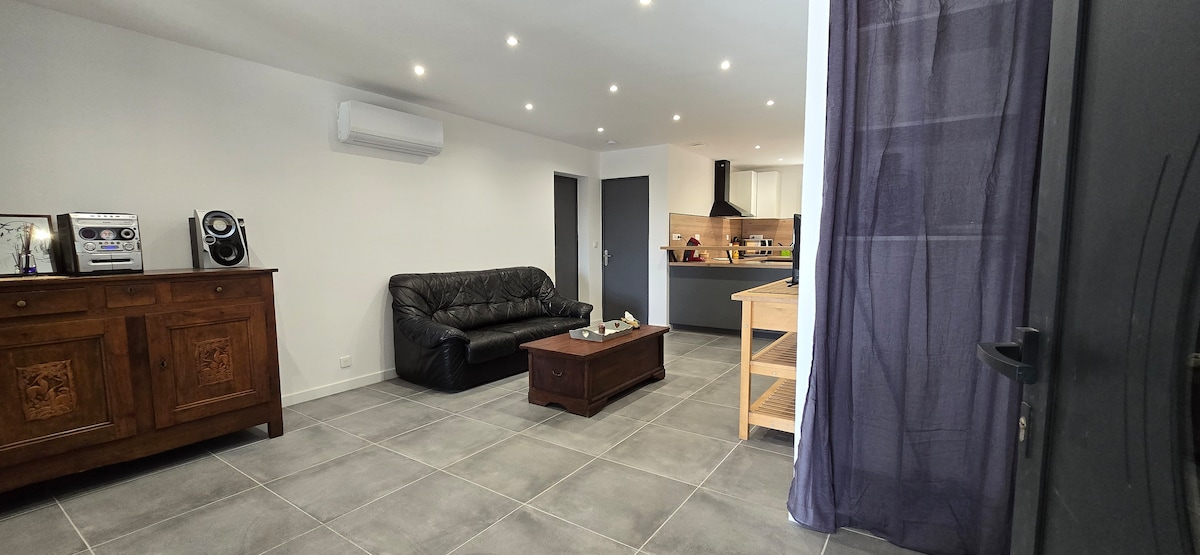 logement indépendant climatisé, dans la cour, derrière notre maison. grande terrasse. Coin toilette avec douche. WC indépendant. Tous deux ont leur accès dans la chambre. On entre dans l appartement directement par le coin cuisine. Pas de lave vaiselle à disposition... Sorry. 1 lit de 2 personnes dans la chambre et 1 convertible dans le salon. Buanderie indépendante, en prolongement de l appartement, et commune a la maison. Lit parapluie possible sur demande.