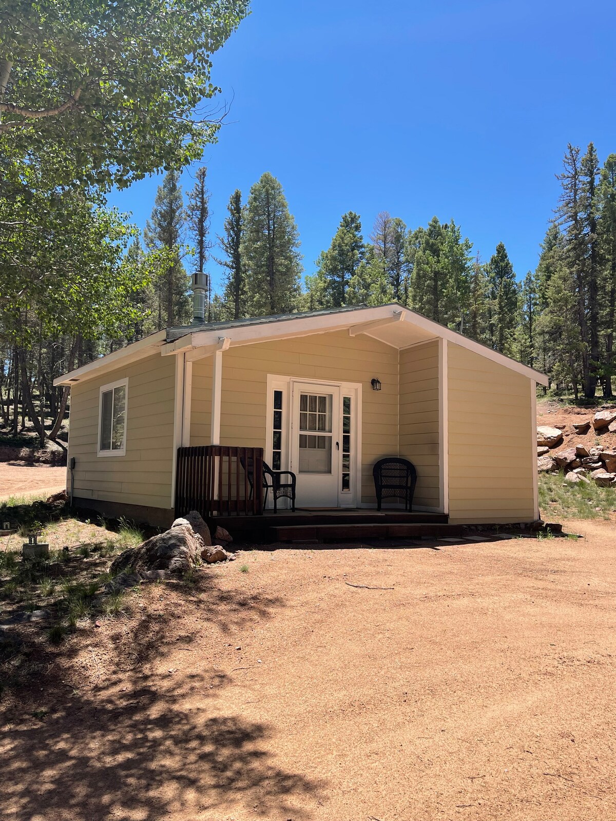 Châssis en A moderne ✦ récemment construit (750 pieds carrés) dans la région de Pikes Peak ✦ Deux chambres confortables (y compris un loft) ✦ Luxueux jacuzzi privé Dôme d'observation des étoiles ✦ chauffé ✦ Terrain boisé pittoresque avec vue sereine ✦ Accès facile aux Fossil Beds, à trois parcs d'État, à la forêt nationale, à la randonnée, à la pêche à la mouche de niveau mondial et bien plus encore ✦ Grande terrasse avec foyer à gaz, sièges Adirondack rembourrés et salle à manger en plein air ✦ Cheminée à gaz intérieure Cuisine ✦ complète avec café et bar à thé ✦ Gril BBQ Weber ✦ Animaux acceptés (un chien max.)
