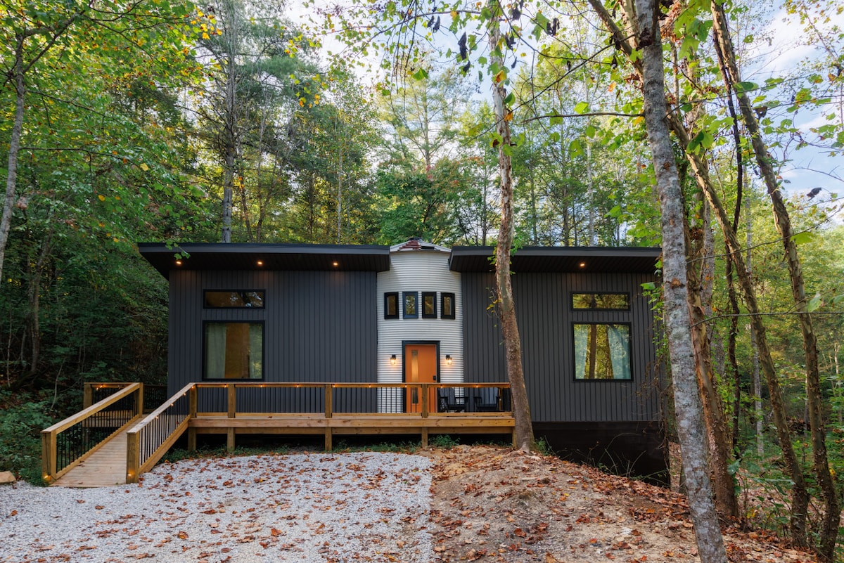 Canopy 9 – Une escapade élégante dans Red River Gorge Niché dans la forêt, Canopy 9 allie design moderne du milieu du siècle, ambiance de cabane confortable et aventure en plein air. Plongez dans le jacuzzi sous les étoiles, balancez-vous dans des hamacs ou faites griller des guimauves près du feu. Une cuisine élégante, des sièges somptueux et un loft de rêve en font l'escapade idéale. À quelques minutes de la randonnée, de l'escalade et des restaurants locaux, c'est là que la détente rencontre l'aventure. Faites vos valises, Canopy 9 vous attend !
