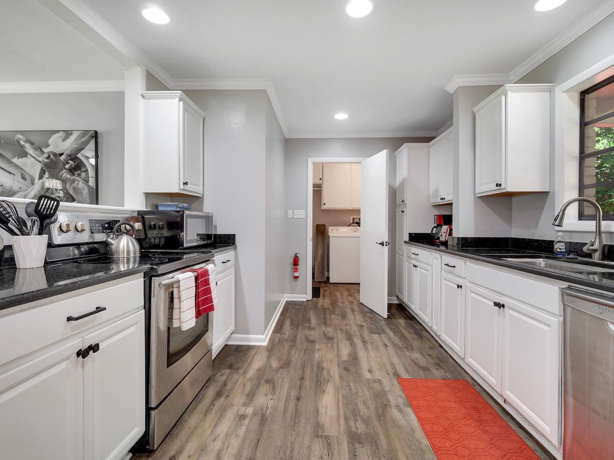 Vous louez tout cet appartement de luxe avec très grand lit (3e étage sans ascenseur) dans le quartier calme et artistique du centre-ville de Tallahassee. Garez-vous gratuitement ou faites une courte promenade jusqu'au Capitole, au centre civique, à la FSU Law School, au DOE, à Gaines St, aux parcs, à College Town, au stade FSU, aux Cascades, aux restaurants raffinés/décontractés/à la vie nocturne. Le maître bénéficie de superbes couchers de soleil depuis ce complexe polyvalent d'architecture européenne. Cuisine entièrement équipée, Wi-Fi, Keurig, buanderie, 2 téléviseurs. Canapé convertible pour 2 personnes. Les week-ends de match nécessitent un minimum de 2 nuits.