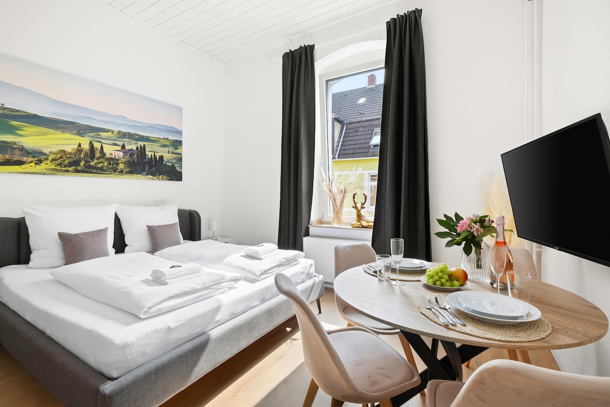 Bienvenue à Essen ! Que vous soyez à la recherche d'une deuxième maison ou d'un logement calme pour travailler. Notre appartement a été récemment meublé et dispose d'équipements modernes, y compris un lit queen size de 1,40 m pour des nuits et des rêves reposants. Notre voyage d'invité activé numériquement sans accueil physique et sans personnel sur place rend votre séjour encore plus agréable. Cet appartement est à seulement quelques minutes de la gare principale et de la Limbecker Platz (shopping).