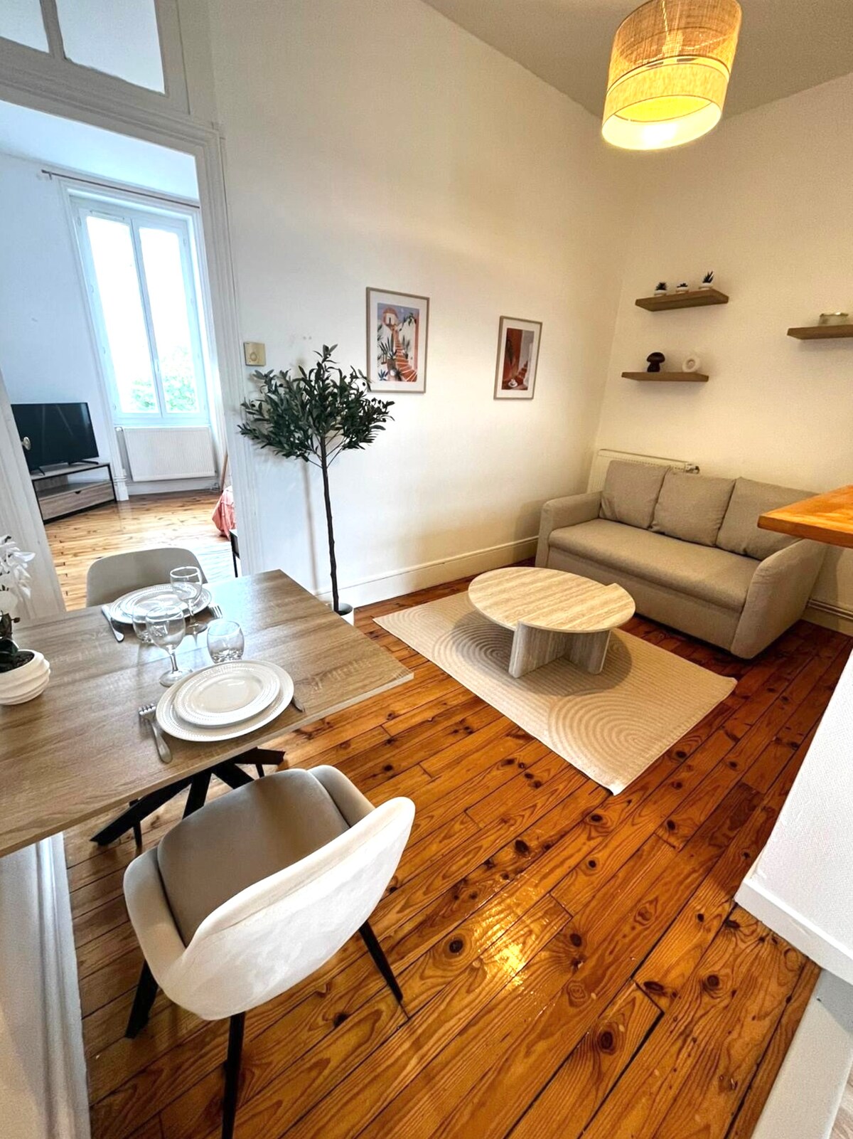 Charmant appartement 2 pièces avec balcon. Il est très bien chauffé (en collectif) et décoré avec soin pour un style cocooning, agréable, chaleureux et confortable. Situé au 3e étage avec ascenseur en Hyper-centre (80 m de l'Hôtel de ville). Equipé d'une Box TV connectée. . Accueil soigné. Proche de toutes commodités, bars, restaurants, shopping, cinéma et musée. Transports par tram et bus à 80 m , gare à 15 min à pied. Garage suivant disponibilité à confirmer impérativement à la réservation.