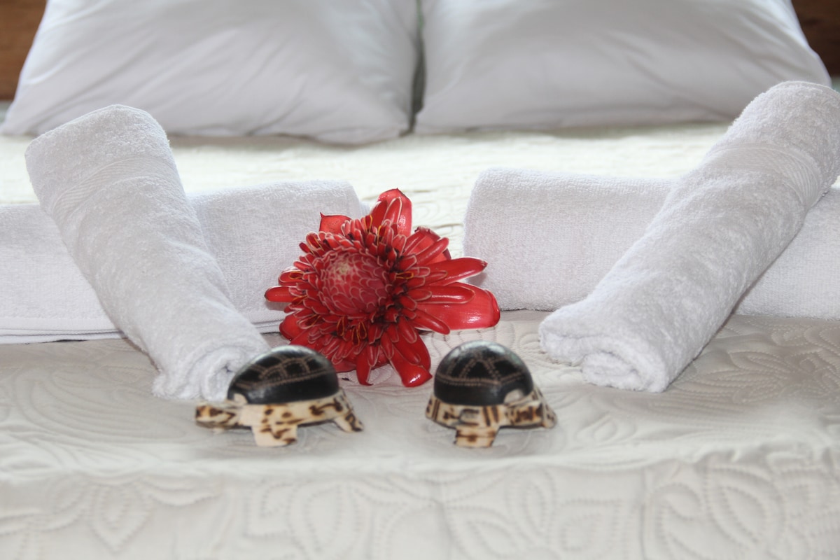 Cette maison de deux étages offre une vue magnifique sur le jardin de la jungle et la rivière, avec une famille de singes qui passe tous les jours. Composée de deux étages, cette maison confortable dispose d'un patio à côté de la chambre à l'étage (avec un lit double) où vous pourrez vous asseoir et profiter de la vue. En bas se trouve un espace de travail dédié, et avec l'accès à Internet haut débit, vous pourrez travailler depuis cette belle demeure dans la jungle ou regarder un film sur le canapé dans le confort (le canapé peut également être transformé en lit pour accueillir une personne supplémentaire).