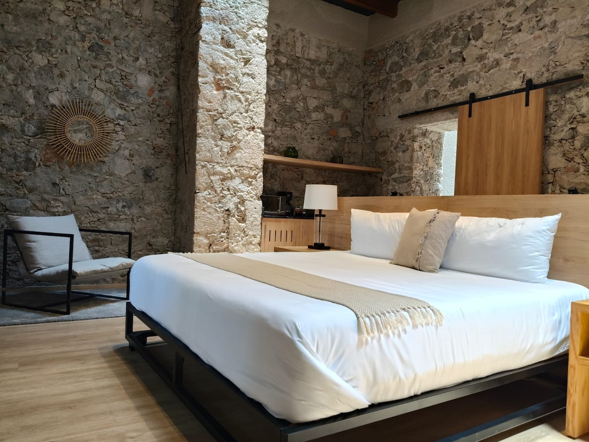 Belle suite Concept de boutique meublé avec une touche antique mais entièrement équipé. Au cœur du centre historique. Bel appartement situé dans la rue piétonne dans le meilleur emplacement du centre-ville avec une incroyable terrasse privée sur le toit. L'appartement peut accueillir 2 personnes est entièrement équipé avec salle de bain privée, cuisine et salle à manger. Accès à pied à tout le centre-ville de Queretaro. L'endroit est propre, calme et plein de design. Belle terrasse Coffre-fort Salle de bains Lit queen size Salle à diner Salon 49