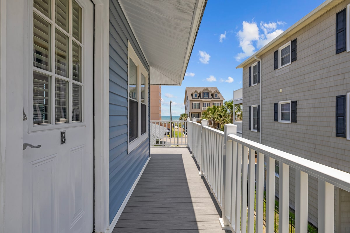 Totalement à la plage - L'unité n° 2 est l'une des 4 condos spacieuses situées à un pâté de maisons de la plage et à 2 pâtés de maisons de la jetée de pêche au cœur de l'historique Cherry Grove. Chaque unité est de 900 pieds carrés avec 2 chambres, une salle de bain, une cuisine complète et un salon avec accès au porche avant et arrière. Le porche arrière donne sur un étang naturel regorgeant d'oiseaux échassiers et d'autres espèces sauvages. Les voyageurs disposent de l'essentiel : draps, serviettes/vêtements de bain, ustensiles de cuisine et cafetière Keurig. L'unité n° 2 est au 2e niveau à droite.