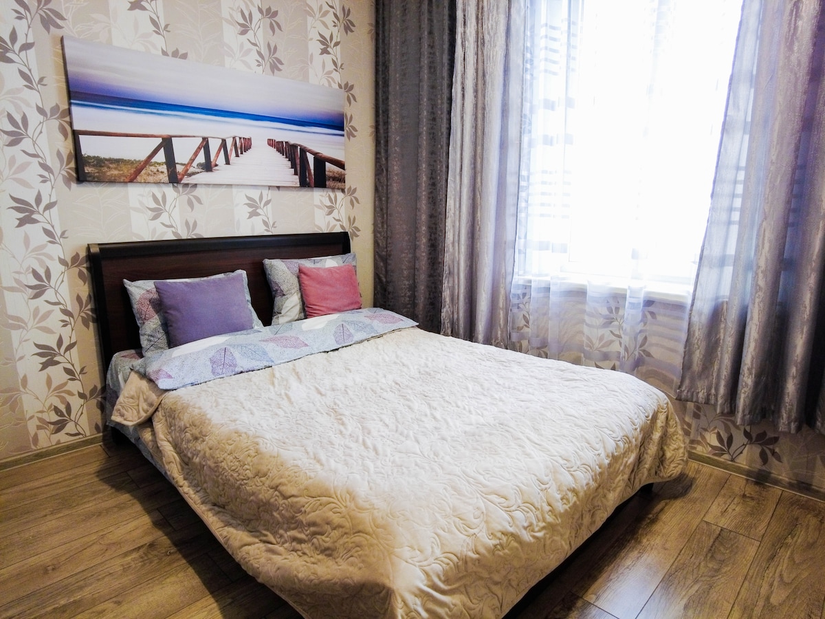 L'appartement dispose d'un grand lit confortable avec un nouveau matelas et un canapé pliant. L'appartement est spacieux - 48 m ² avec son propre balcon confortable donnant sur la zone piétonne. La pièce est divisée en deux portes coulissantes séparées. L'appartement est chaud en hiver et frais en été. Il y a une télévision, uneCONNEXION WI-FI. Pour un séjour sans soucis, il y a :vaisselle, linge de lit propre, ensembles de serviettes, lave-linge, sèche-cheveux, réfrigérateur, micro-ondes, bouilloire électrique, fer à repasser, eau filtrée, produits d'hygiène. L'appartement dispose d'un grand lit confortable.