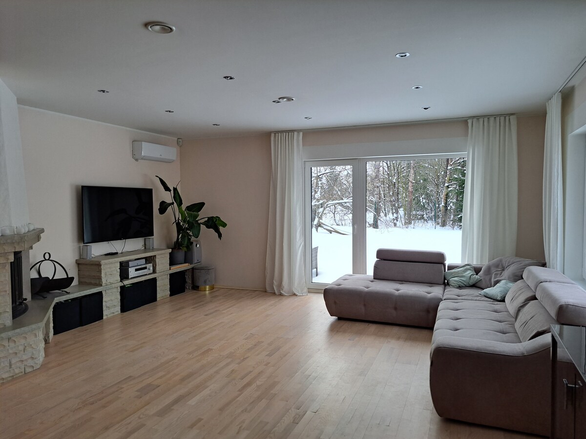 Maison familiale de 3 chambres juste à côté de Tallinn. Profitez d'un grand salon avec cheminée, télévision et système audio. Jardin avec terrasse avec vue sur une petite forêt, un barbecue et une aire de jeux pour enfants. Parking privé. Explorez l'aire de jeux pour enfants et la balançoire du village à proximité. Découvrez la sérénité du village à seulement 15 min en voiture du centre-ville de Tallinn. Taxis et transports en commun disponibles. 20-30 min des plages et des sentiers naturels. Parfait pour les familles ou toute personne à la recherche d'un hébergement calme.