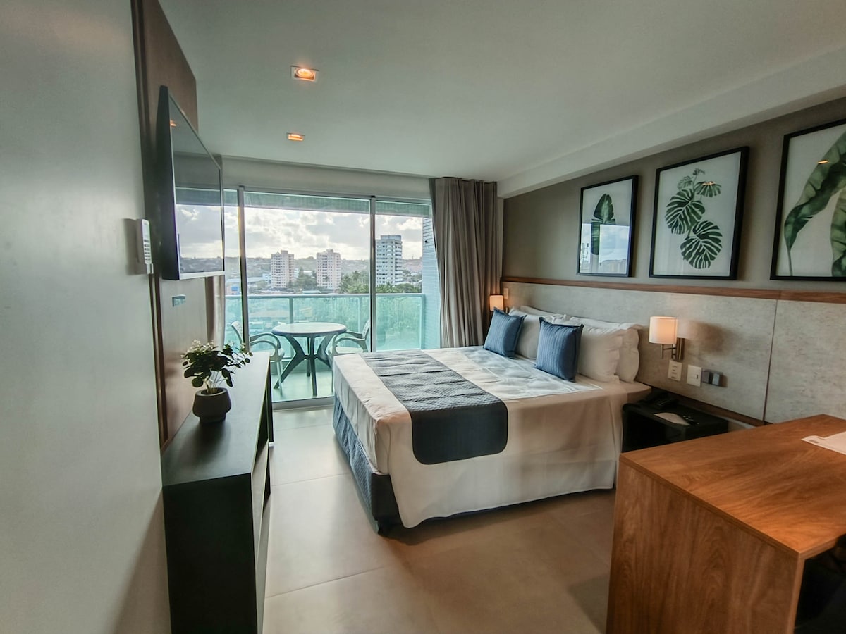 Studio a 3 minutos da praia. Basta atravessar a rua e em poucos passos seus pés já estarão na areia! Acomoda até 3 pessoas com conforto, com vista exuberante. O edifício oferece diversas comodidades: Piscina, academia, espaço kids, sala de estudos e vaga rotativa gratuitos. Tendo ainda sala de convenções, churrasqueira e sala de cinema para locação. O prédio conta com restaurante, lavanderia, padaria e loja de conveniência. Excelente localização, próximo a shoppings, faculdade e supermercados.