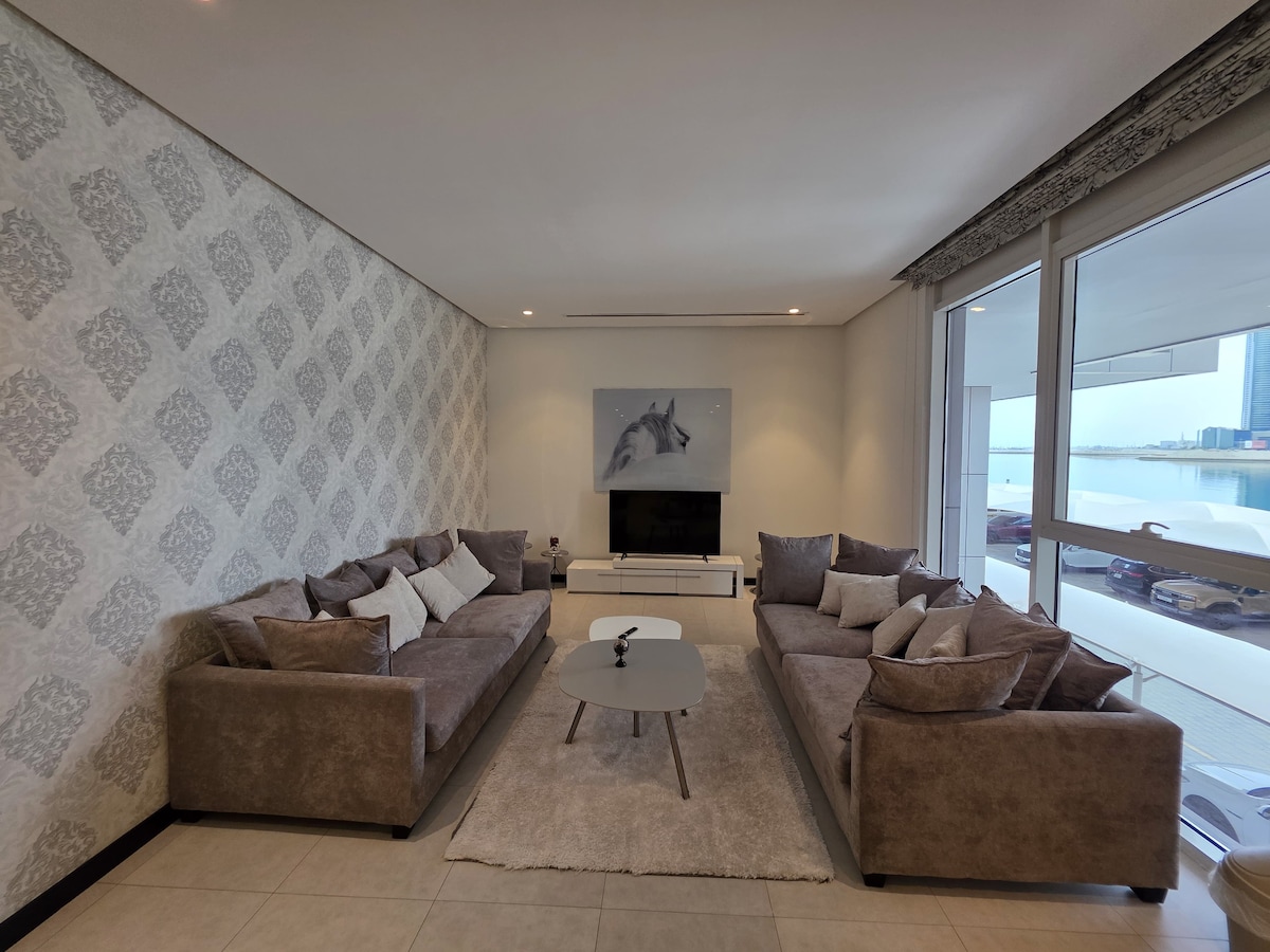 Amenez toute la famille dans ce super endroit avec beaucoup d'espace pour s'amuser. 2 grands balcons avec lumière naturelle. De nombreux restaurants de marque et rayons de soleil, un grand supermarché à proximité, des plages tranquilles, Dragon City (marché chinois) pour faire du shopping, des promenades à pied et à vélo en toute sécurité. Facilement relié aux autoroutes qui vous mèneront n'importe où à Bahreïn en quelques minutes et à la chaussée saoudienne en toute simplicité. Cinémas à proximité. C'est tout simplement un appartement à couper le souffle pour passer de merveilleuses vacances de loisirs, de divertissement et de détente.
