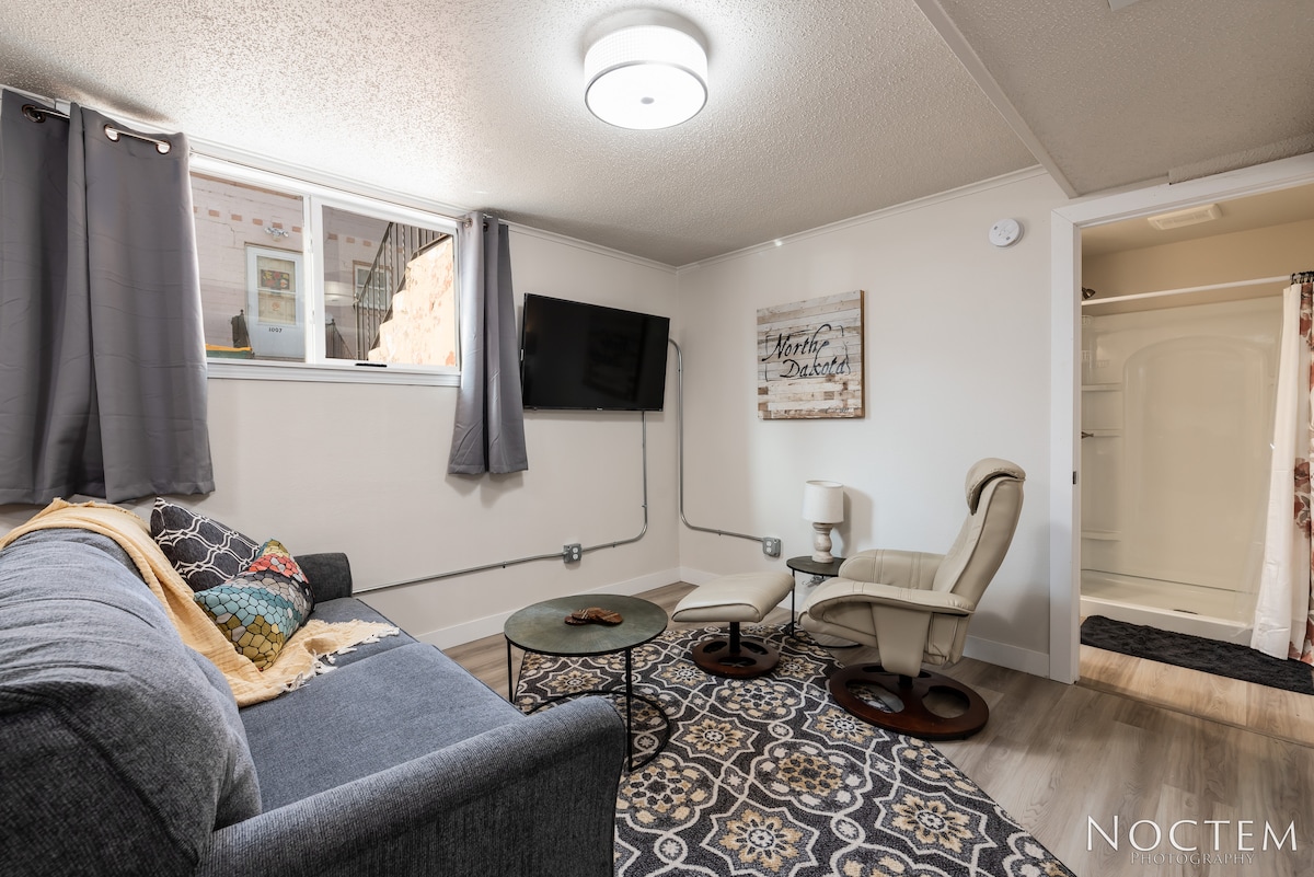 Cet espace est un appartement de sous-sol de deux chambres récemment rénové, spacieux et très propre, avec une cuisine complète, une grande salle de bain et 1 800 pieds carrés d'espace de vie pour vous et vos proches pour vous détendre ! Idéalement situé à proximité de l'aéroport de Bismarck, des hôpitaux et du Capitole de l'État, cet appartement est entièrement équipé pour les séjours de longue durée ! Que vous voyagiez pour le travail ou pour le plaisir, nous serions ravis de vous accueillir ! C'est un endroit chaleureux et confortable pour que vous vous sentiez comme chez vous.