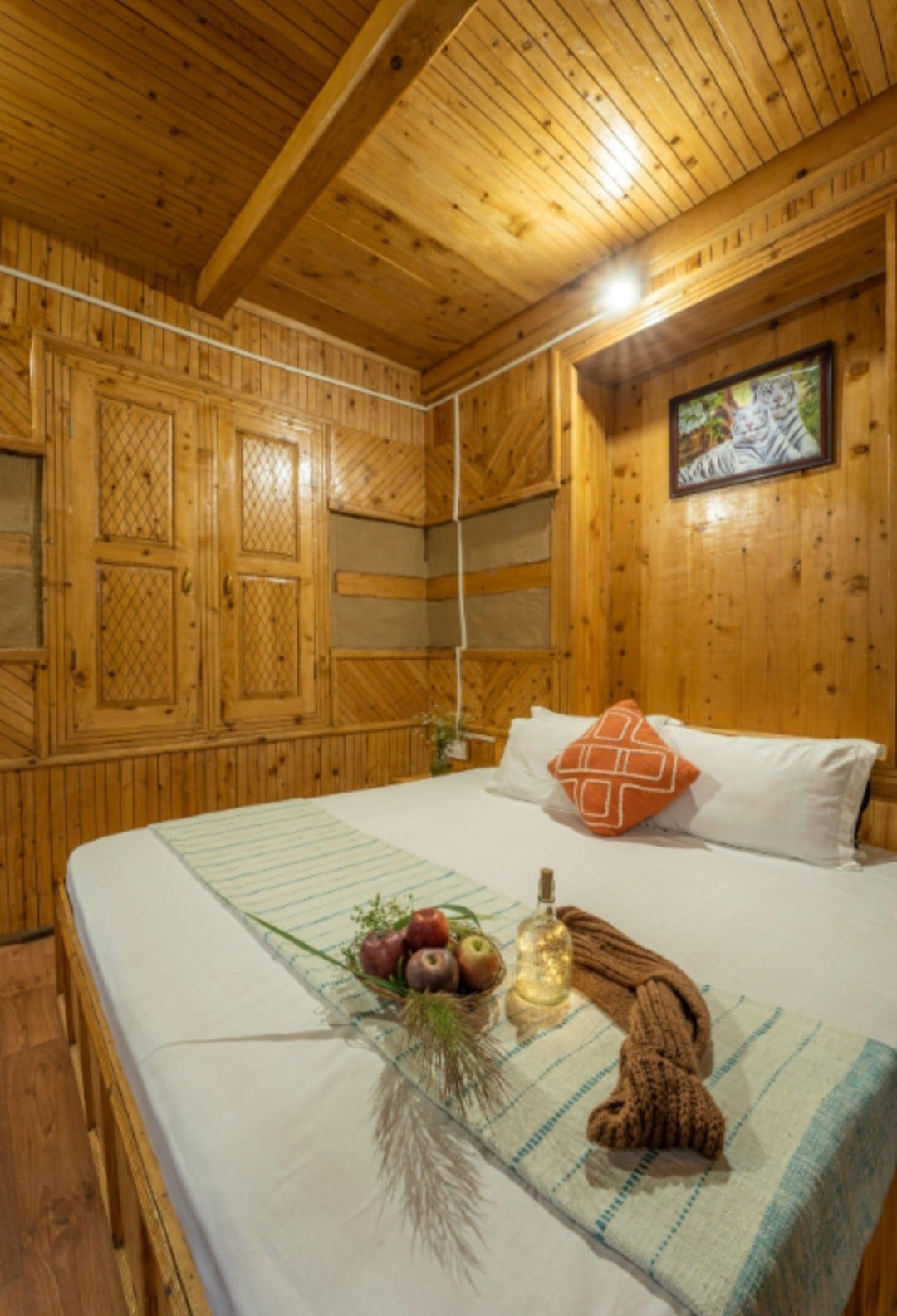 Séjournez dans un confortable chalet traditionnel en bois Himachali entouré de vergers de pommiers et de pruniers dans la paisible vallée de Sainj. Parfait pour les couples et les voyageurs en solo qui souhaitent se détendre dans le calme de la nature. Profitez du lever du soleil sur les sommets enneigés, du chant des oiseaux, du feu de camp, de l'air frais et des repas faits maison. À proximité : cascade de Rupirella (10 km), prairies de Shangarh (15 km), lac Pundrik Rishi (15 km). Remarque : les voyageurs de plus de 50 ans ne sont pas autorisés.