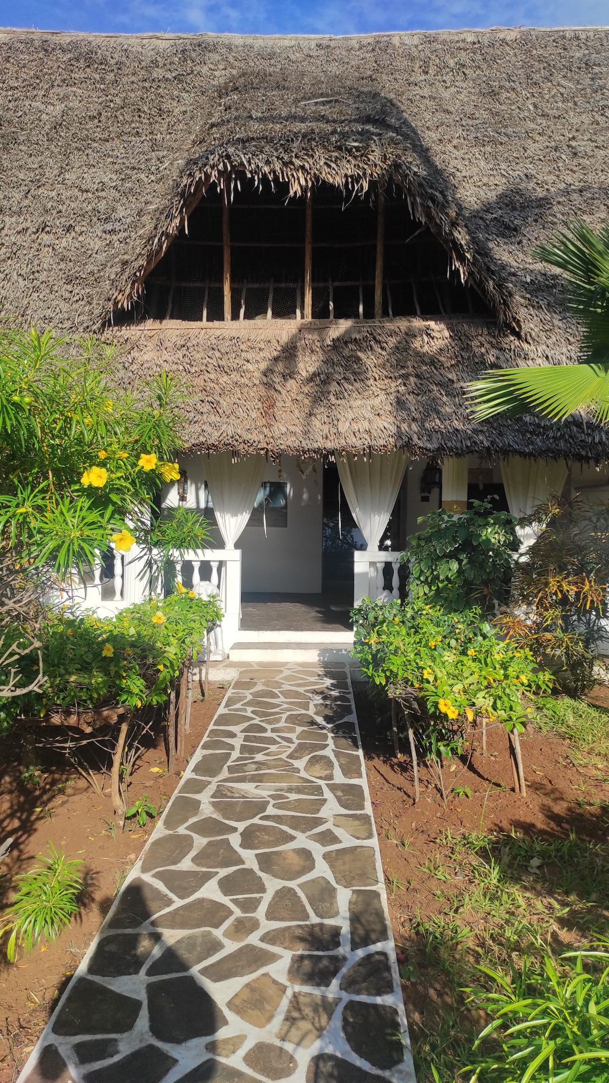Maison de style swahili traditionnel, se dresse sur un promontoire corallien surplombant la mer, la plage, de beaux jardins fleuris, accès privé à la plage. Piscine récemment installée, VOIR LE RÈGLEMENT INTÉRIEUR La villa dispose de 2 niveaux et d'une vue sur l'océan Indien, d'un accès direct privé à la plage, qui s'étend de chaque côté, dans le parc marin. Comprend 3 membres du personnel, un cuisinier, un service de chambre quotidien et un jardinier. Jusqu'à 10 personnes. Facilement adapté et confortable pour accueillir de petits groupes, en utilisant uniquement les chambres à l'étage.