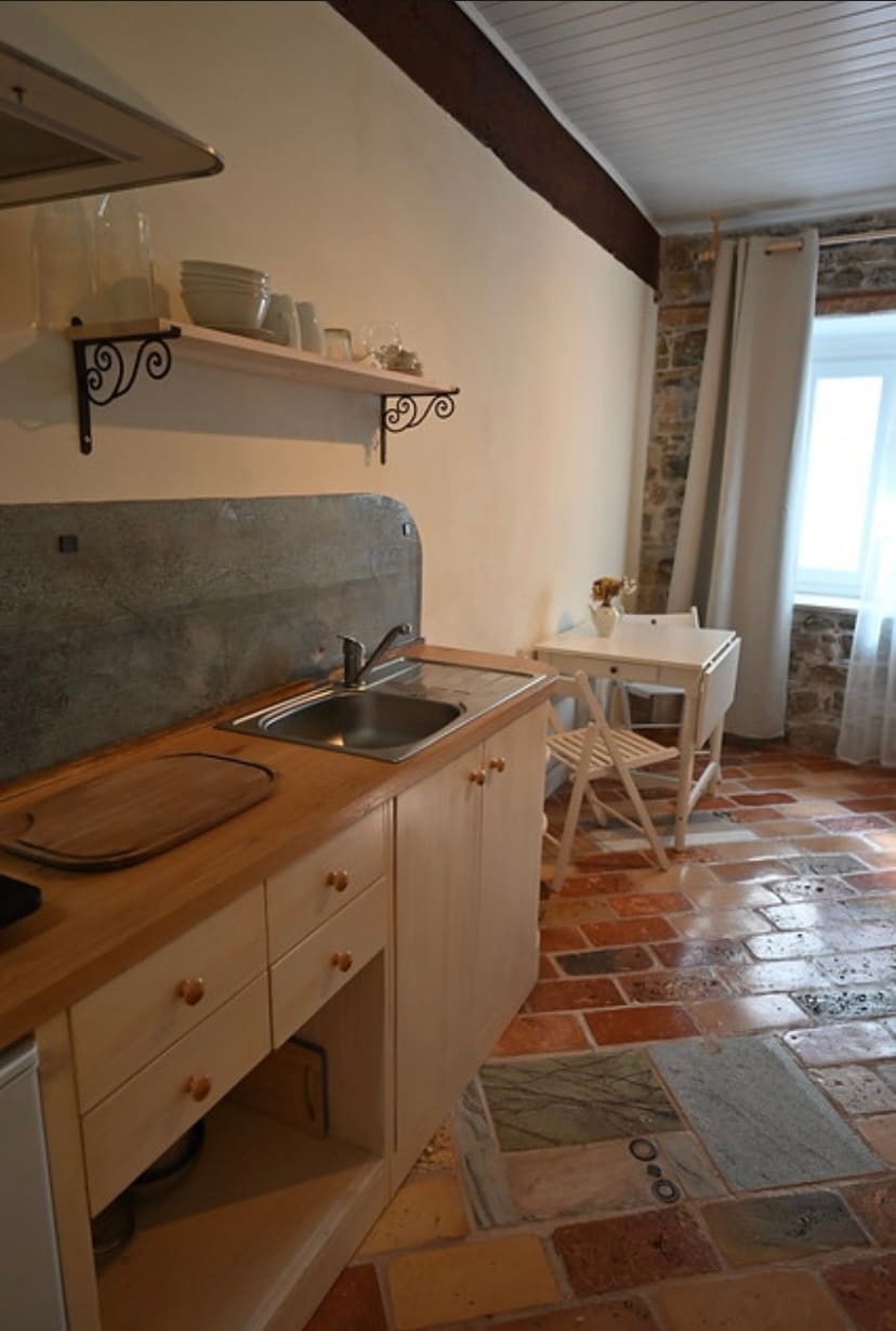 Environnement calme en pleine nature à 5 km de la mer. Maison en pierre avec des meubles en chêne sur 3 étages, avec de grands espaces ouverts. Avec une vue imprenable sur la mer et les Alpes. À proximité, les propriétaires ont du fromage, de sorte que différents fromages indigènes peuvent être dégustés. Dans les prairies voisines, vous pouvez également faire paître des moutons. La distance de la ville garantit la paix et la liberté. Idéal pour les familles, les cyclistes et tous ceux qui aiment le plein air. Les voyageurs bénéficient d'une réduction de 30 % sur leur billet aquatique.