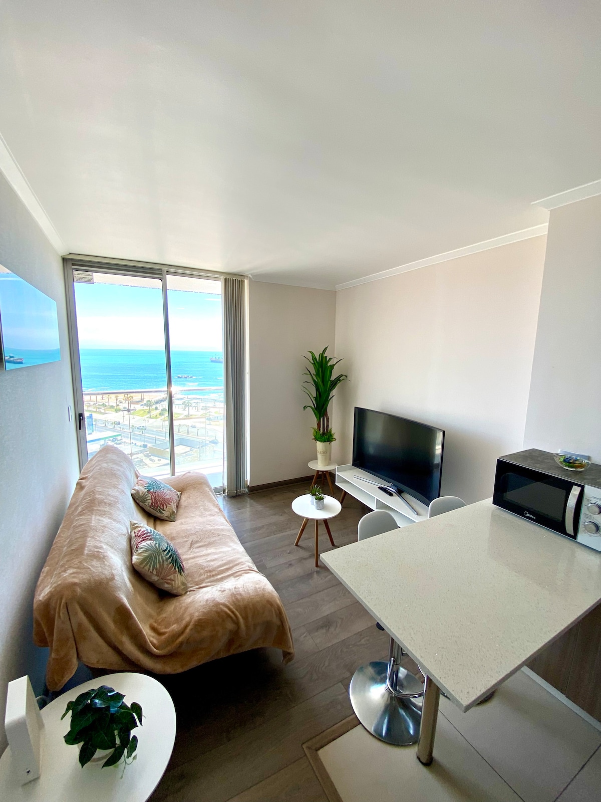 Appartement entrée indépendante, vue sur la mer et parking privé intérieur. Entièrement meublé, secteur Lider Express à 10 min du centre. À 2 pâtés de maisons à pied de super lider express. À 5 min de la municipalité. À 3 min de l'hôpital régional. À 3 min du terminal de bus. À 30 minutes de l'aéroport. Wifi et télévision smart tv de 43", avec Netflix, HBO premium. Cuisine entièrement équipée ; bouilloire, four électrique, micro-ondes et lave-linge séchant fauteuil inclinable. Chaise reposante avec vue sur la mer Conciergerie 24 h/24