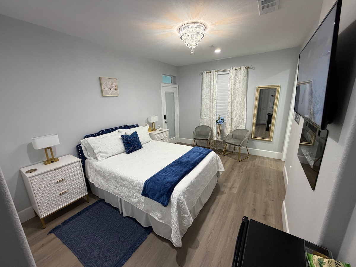 Cette suite dispose d'une kitchenette équipée d'un micro-ondes, d'un lave-linge/sèche-linge, d'un réfrigérateur (sans congélateur) et de petits appareils pour répondre à vos besoins. Le salon est meublé d'une télévision de 50 pouces et d'un canapé de style milieu du siècle qui se replie dans un lit juste à côté d'une élégante table haute avec des tabourets. La chambre a accès à son propre patio fermé et à une salle de bain attenante avec douche (pas de baignoire). À seulement 25 minutes des vignobles de Temecula, des magasins d'usine de Lake Elsinore et du centre commercial le plus proche est à seulement 5 minutes.